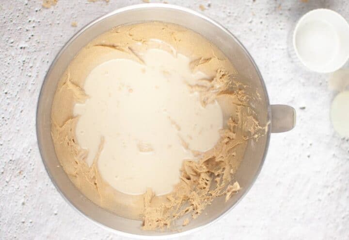 - Mix in 4 tablespoons melted butter, ½ cup brown sugar, ½ cup granulated sugar, vanilla, milk, and egg. Mix well until the batter is smooth.